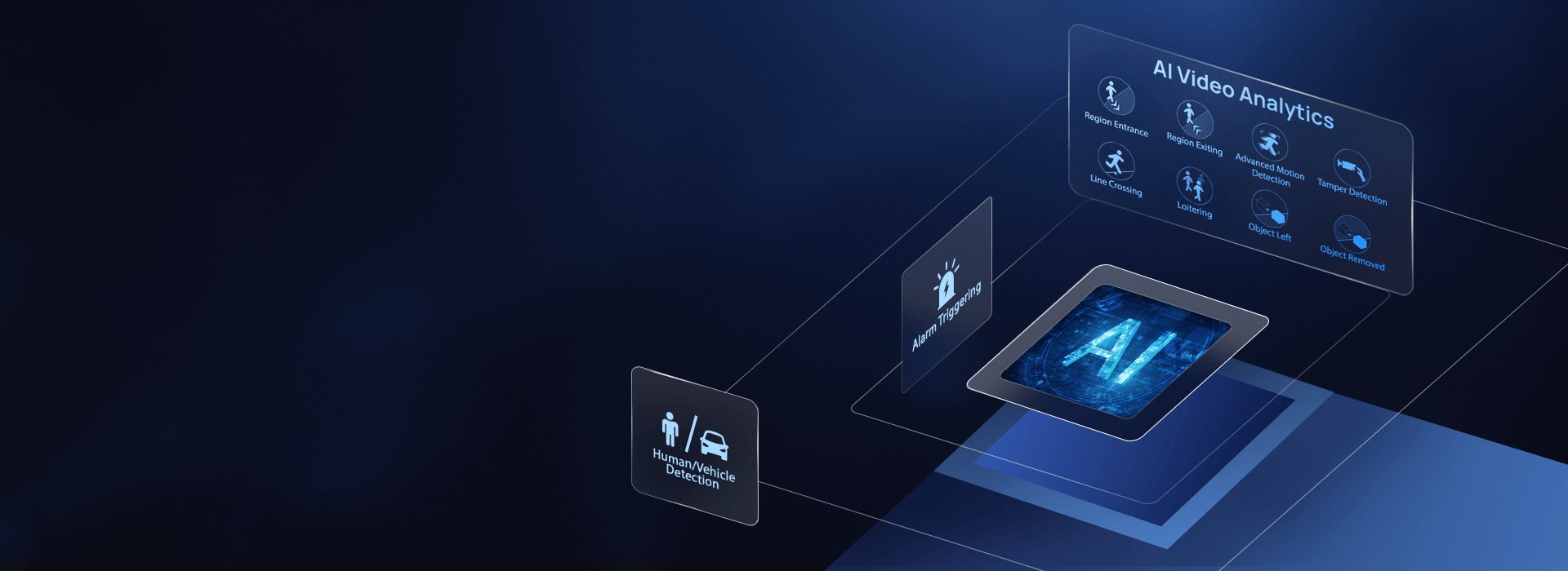 Region Entrance, Region Exiting, Advanced Motion Detection, Tamper Detection, Line Crossing, Loitering, Object Left, Object Removed |