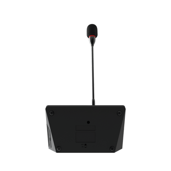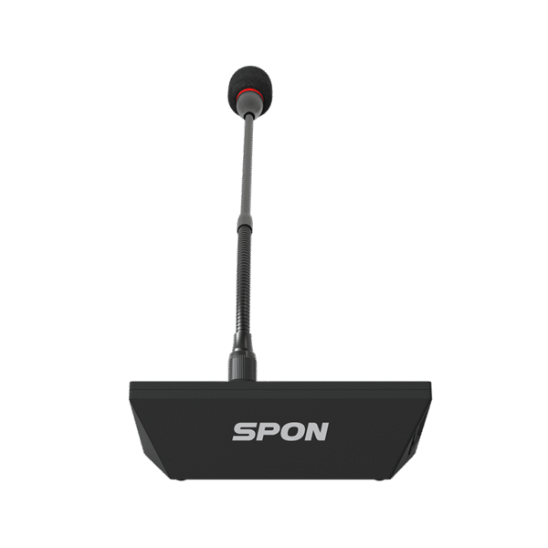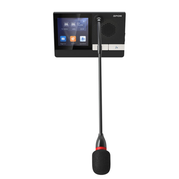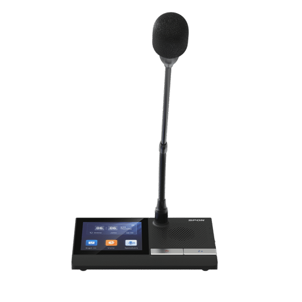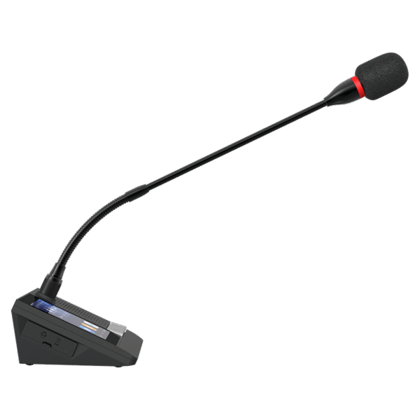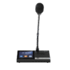 This wireless chairman microphone unit is equipped with a 4-inch full-color touch screen for easy access to sign-in, voting, and agenda control. A built-in 4000mAh lithium battery powers long meetings. It features video tracking and allows input gain, EQ, and auto-gain settings through the conference host. A premium tool for professional meetings.